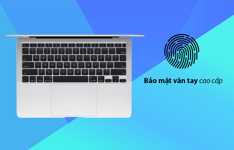 Hơn thế nữa, Macbook Air 2020 còn được trang bị thêm công nghệ bảo mật cảm biến bằng vân tay đỉnh cao, có thể cho phép người dùng mở khóa và khởi động máy chỉ bằng một cái chạm tay. Giúp tiết kiệm được thời gian và công sức khi không phải nhập mật khẩu rườm rà như cũ.